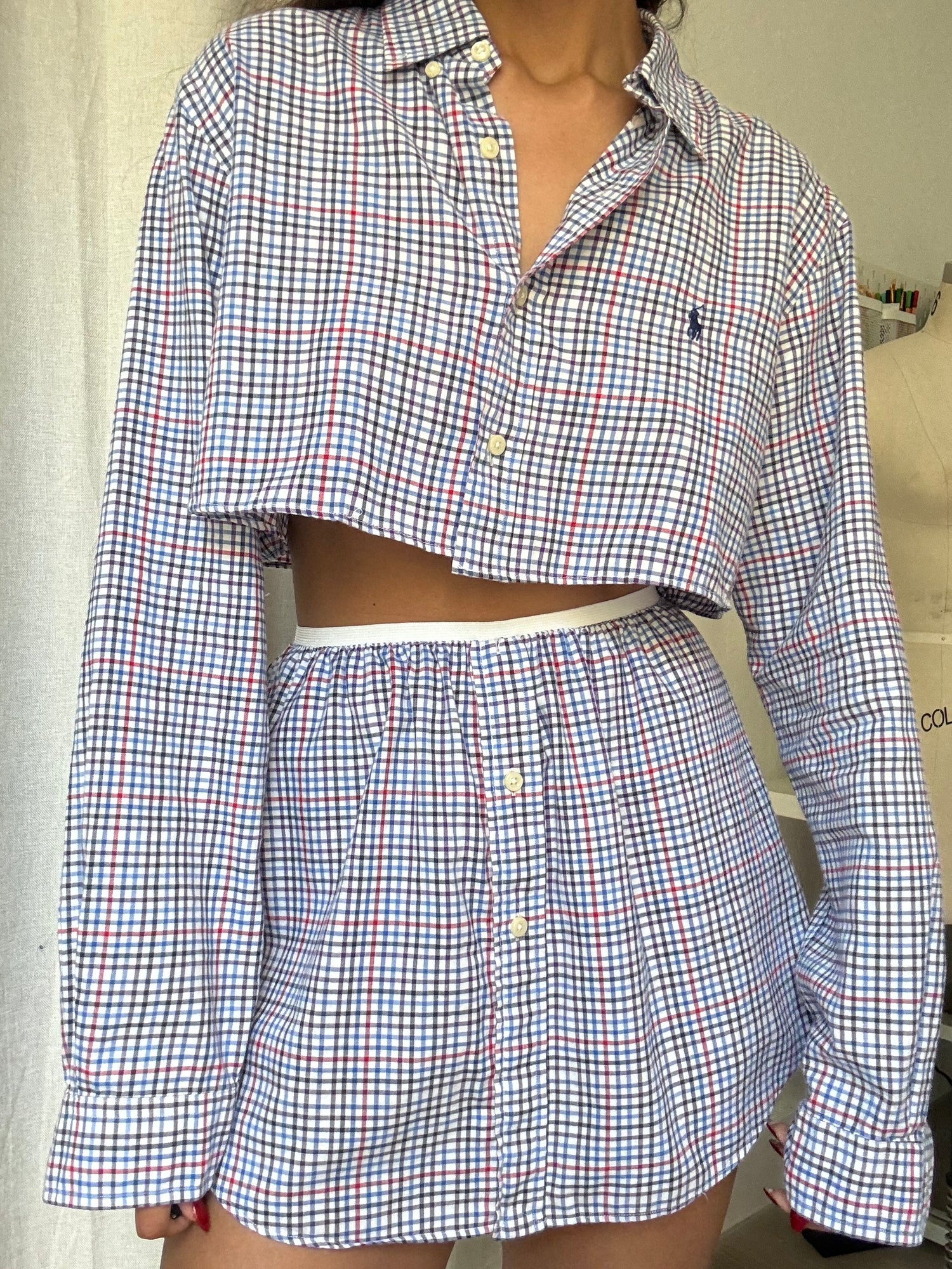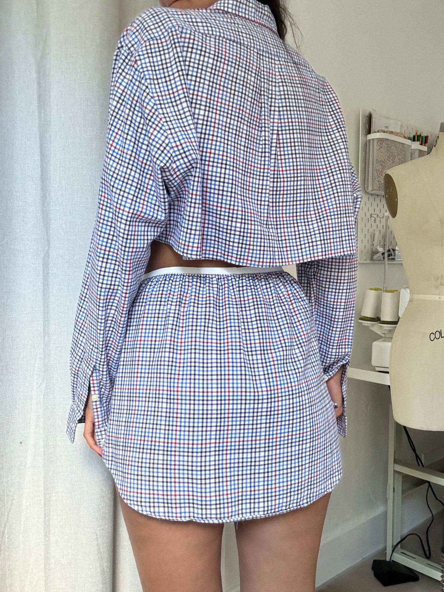 Hand-made from an existing mens dress shirt. cutting up the original piece to make an exclusive and one of a kind set. Kane Top is meant to fit oversized (boxy and longer sleeve) like a boyfriend fit. (Top and Bottom in image sold separately)