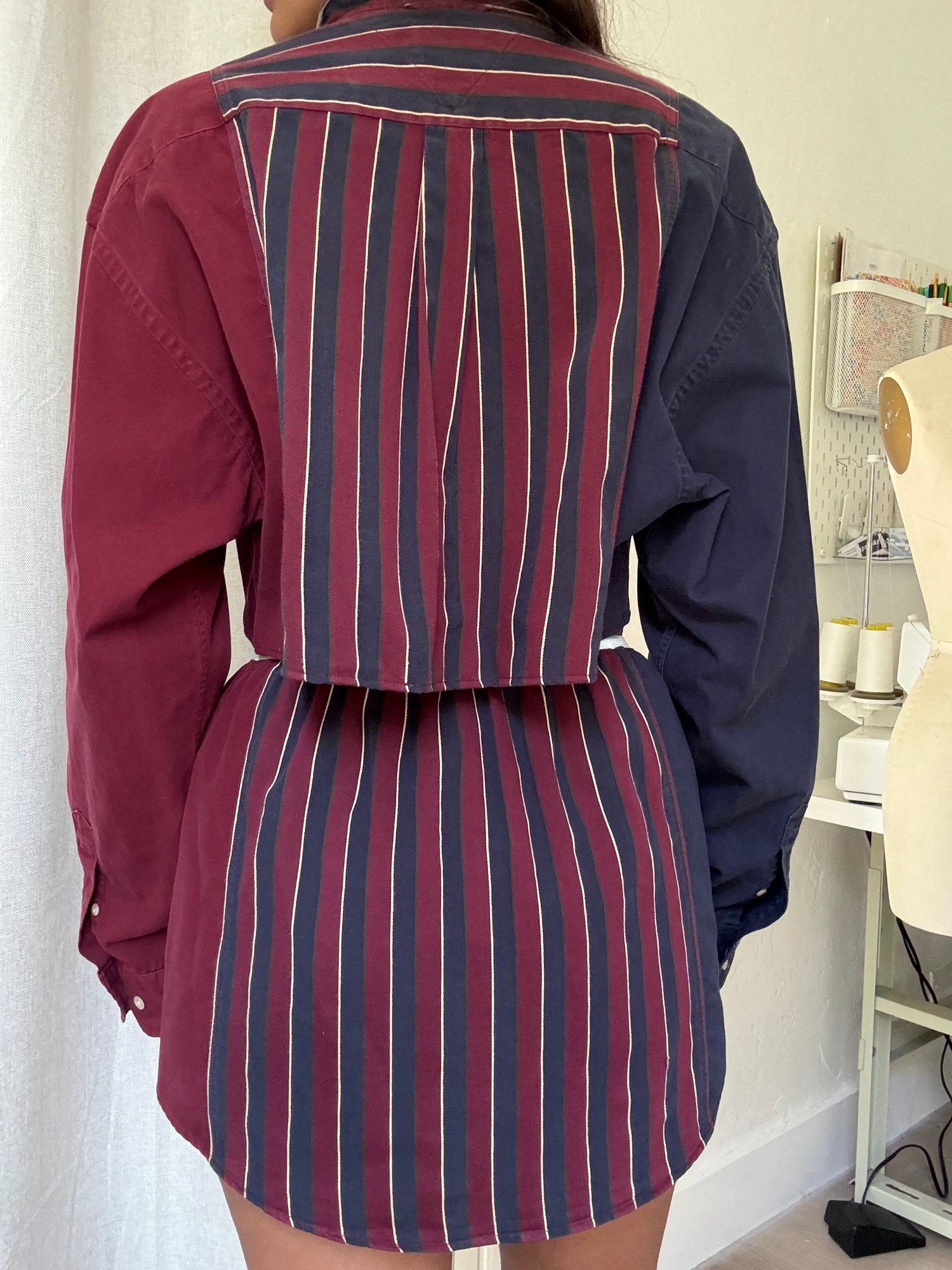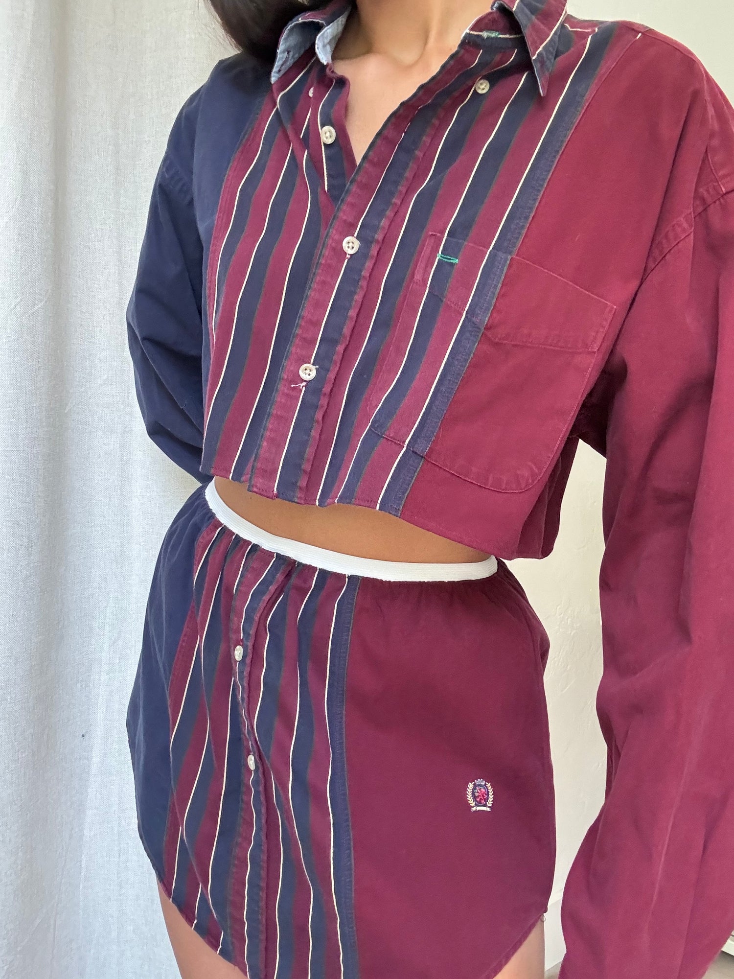Hand-made from an existing mens dress shirt. cutting up the original piece to make an exclusive and one of a kind set. Pablo Top is meant to fit oversized (boxy and longer sleeve) like a boyfriend fit. (Top and Bottom in image sold separately)