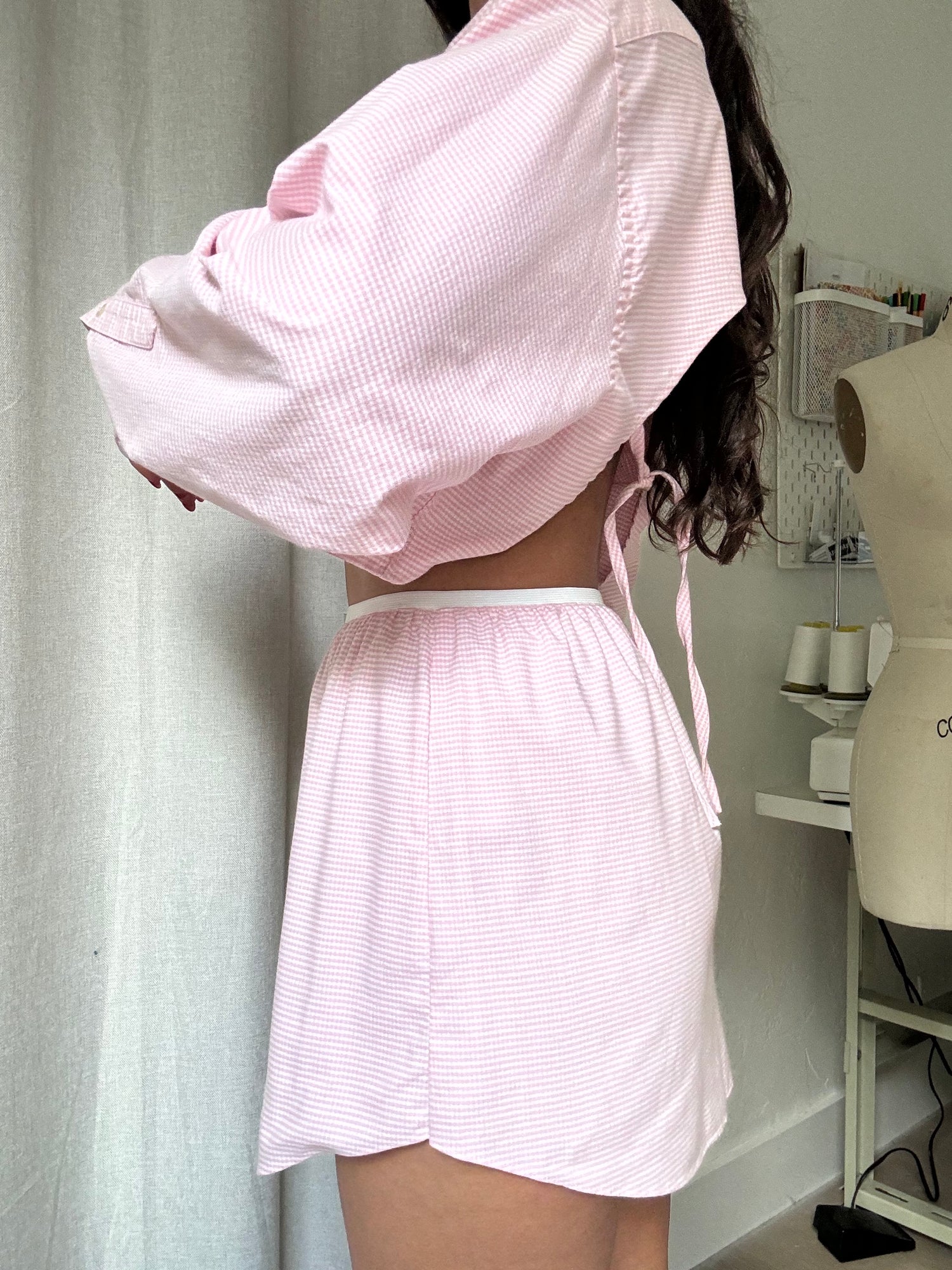 Hand-made from an existing mens dress shirt. cutting up the original piece to make an exclusive and one of a kind set. Sabrina Top is meant to fit oversized (boxy and longer sleeve) like a boyfriend fit. (Top and Bottom in image sold separately)