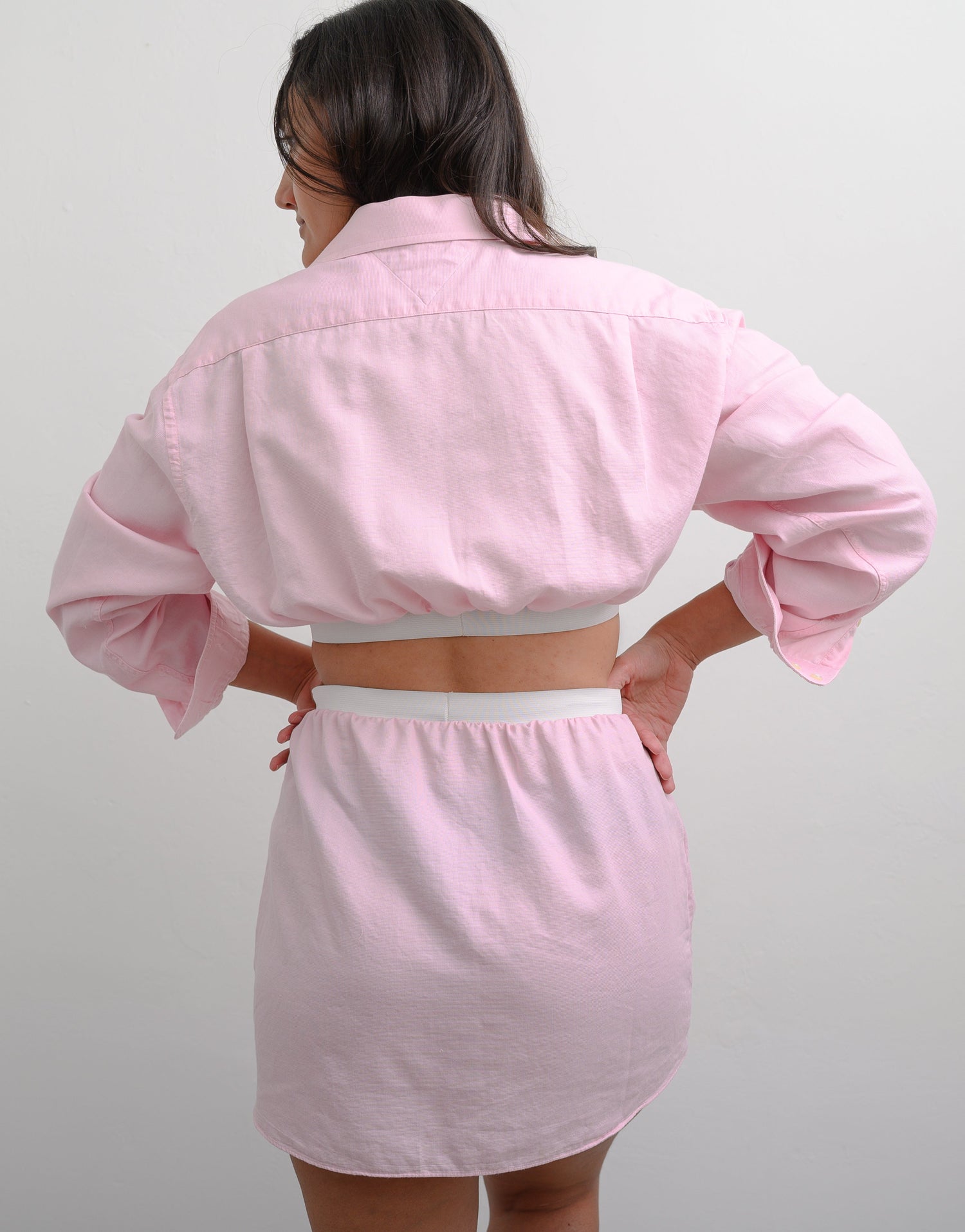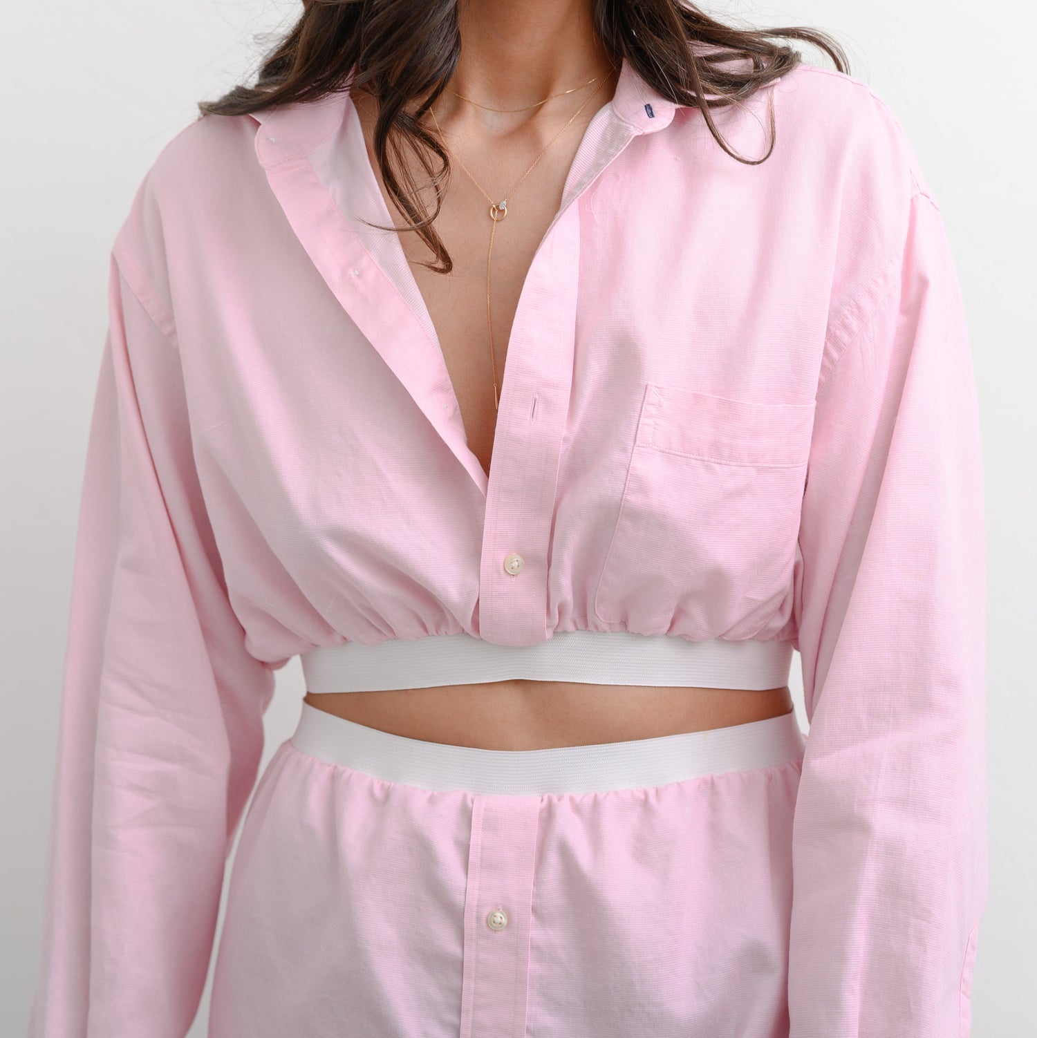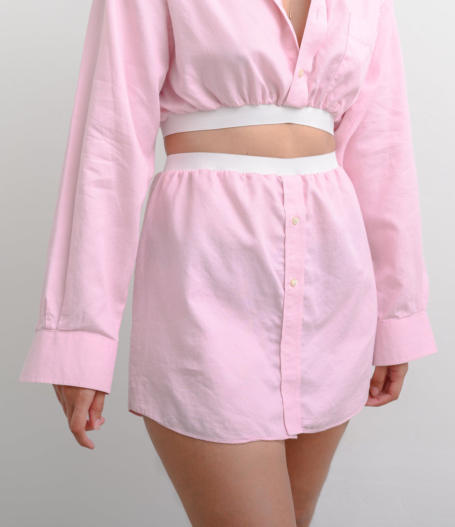 This Nathan Skirt embraces style, comfort and sustainability. Crafted from upcycled mens shirt, the delicate soft pink hues and luxurious fabric create a lightweight yet cozy feel. Perfect for a special occasion, this set is sure to add a touch of sophistication to your wardrobe.