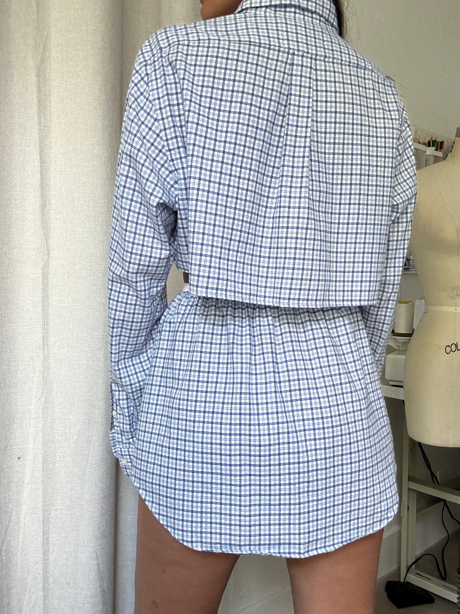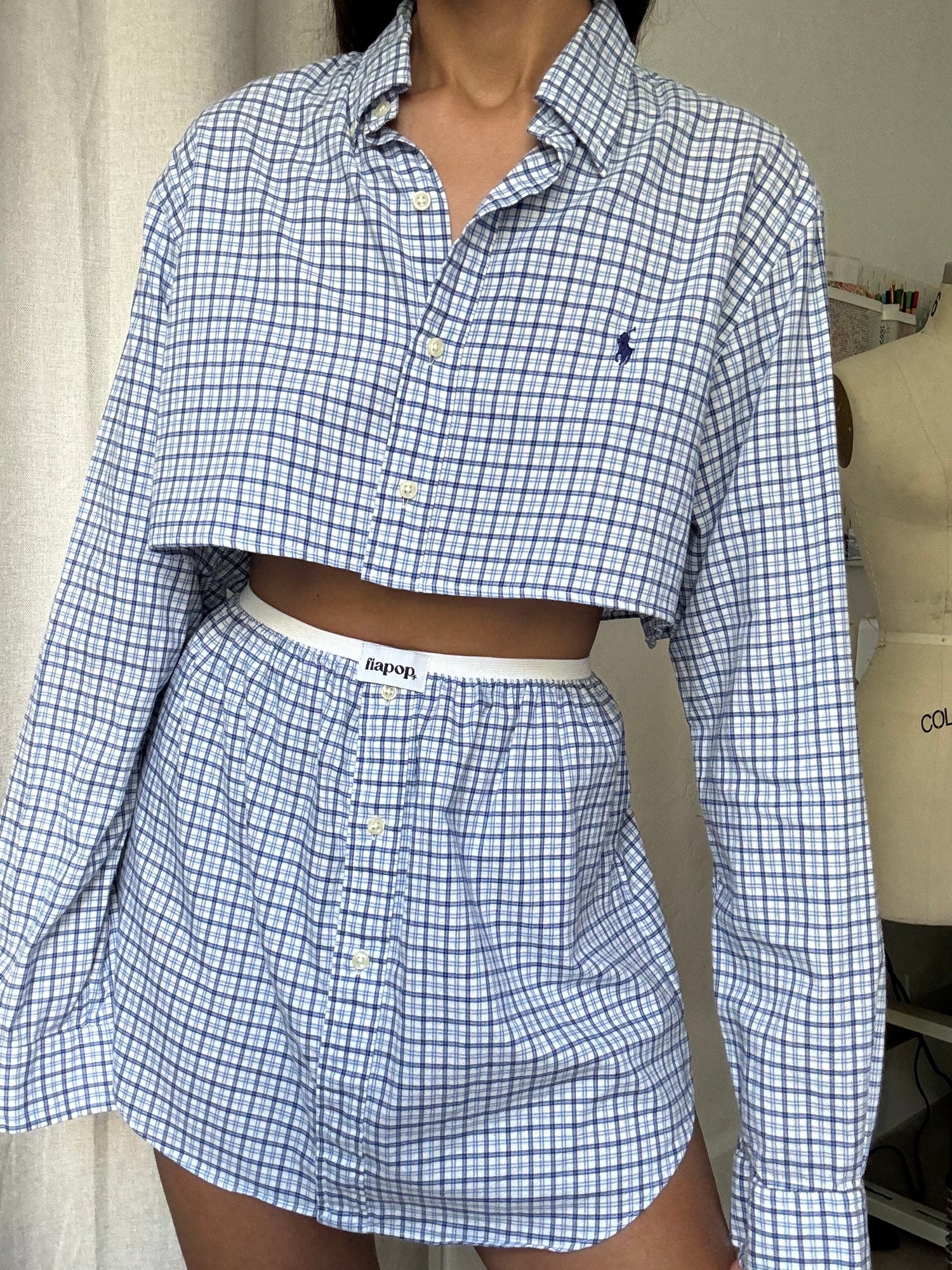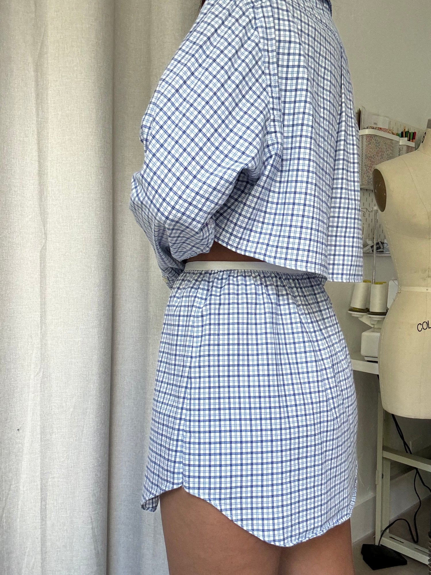 Hand-made from an existing mens dress shirt. Cutting up the original piece to make an exclusive and one of a kind set. Khloe Skirt has an elastic waist of 26" and can fit up to 30" waist. (Top and Bottom in image sold separately)