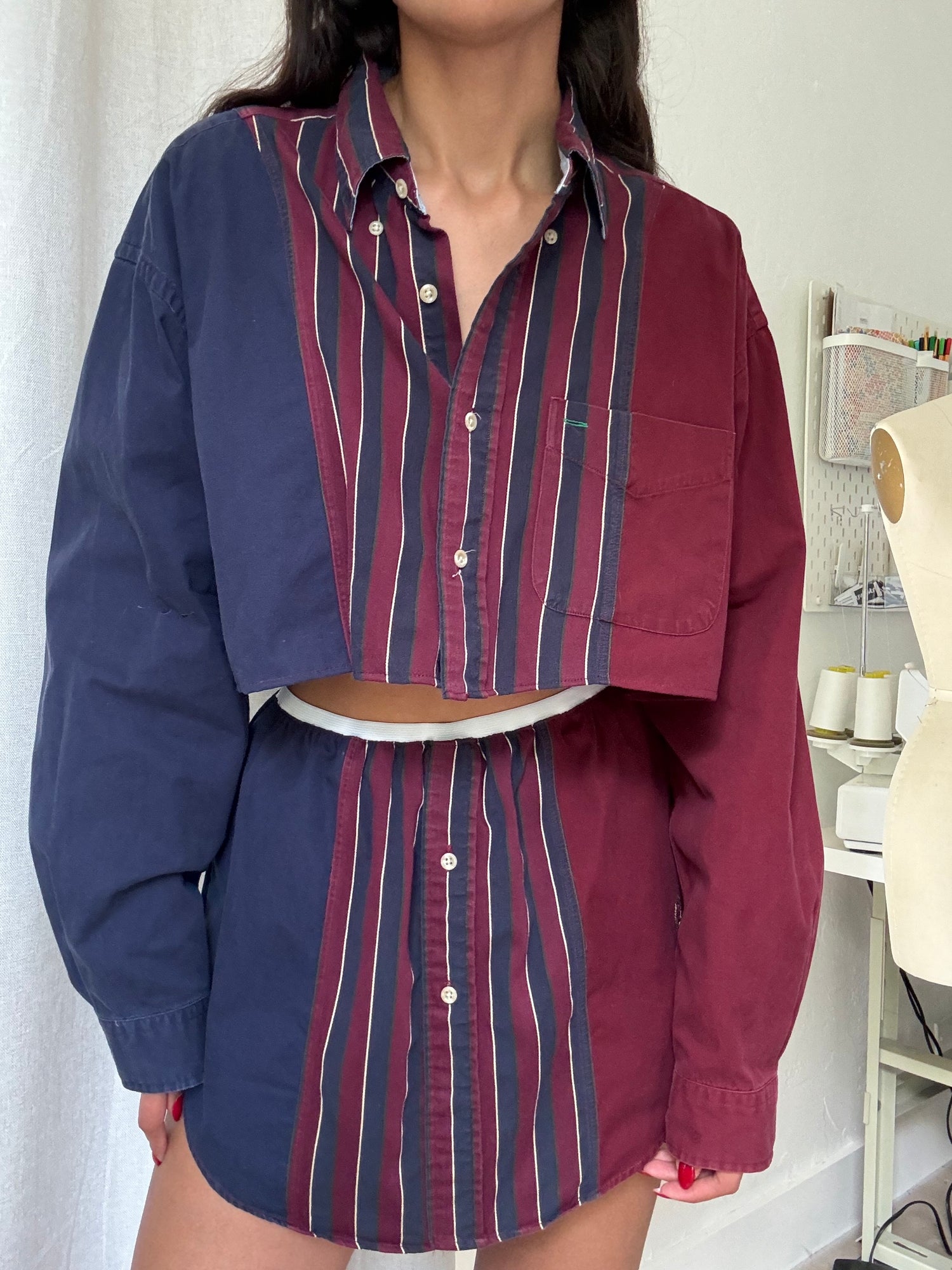Hand-made from an existing mens dress shirt. Cutting up the original piece to make an exclusive and one of a kind set. Pamela Skirt has an elastic waist of 26" and can fit up to 30" waist. (Top and Bottom in image sold separately)