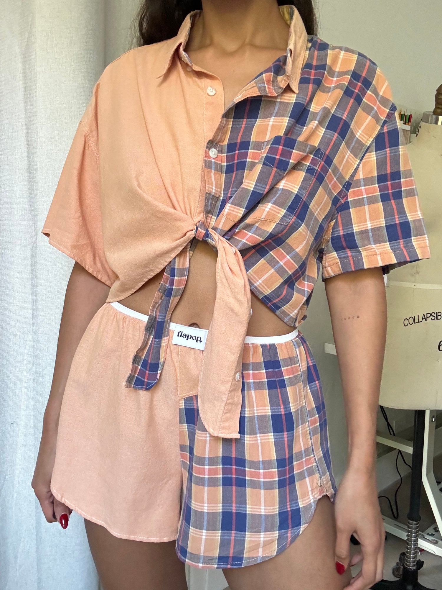 Hand-made from an existing mens dress shirt. Cutting up two full pieces and sewing both halfs together to make an exclusive and one of a kind set. Willow Tie Top is meant to fit oversized (boxy and short sleeve) like a boyfriend fit. (Top and Bottom in image sold separately)