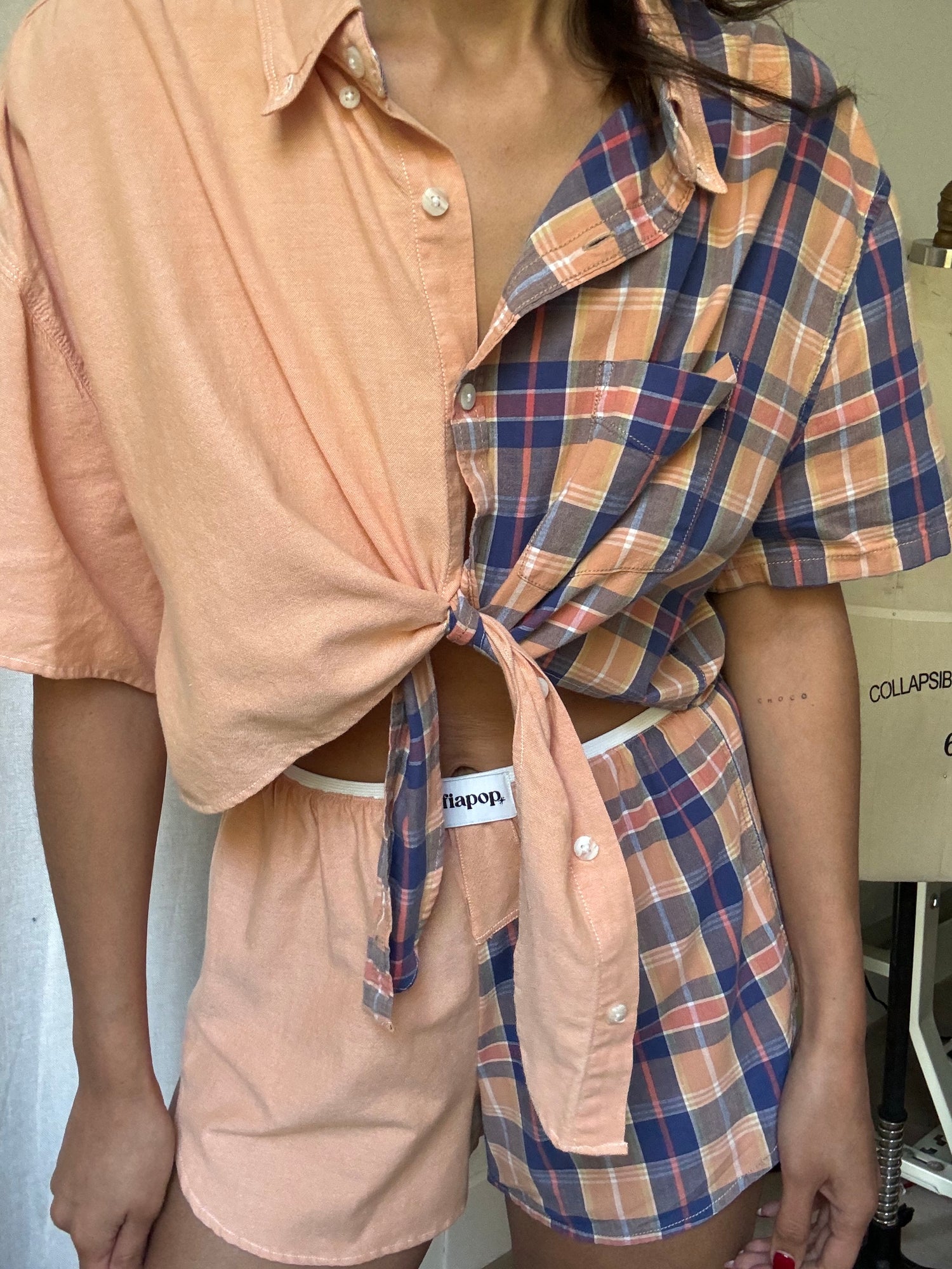 Hand-made from an existing mens dress shirt. Cutting up the original piece to make an exclusive and one of a kind set. Woke Short has an elastic waist of 26" and can fit up to 30" waist. (Top and Bottom in image sold separately)