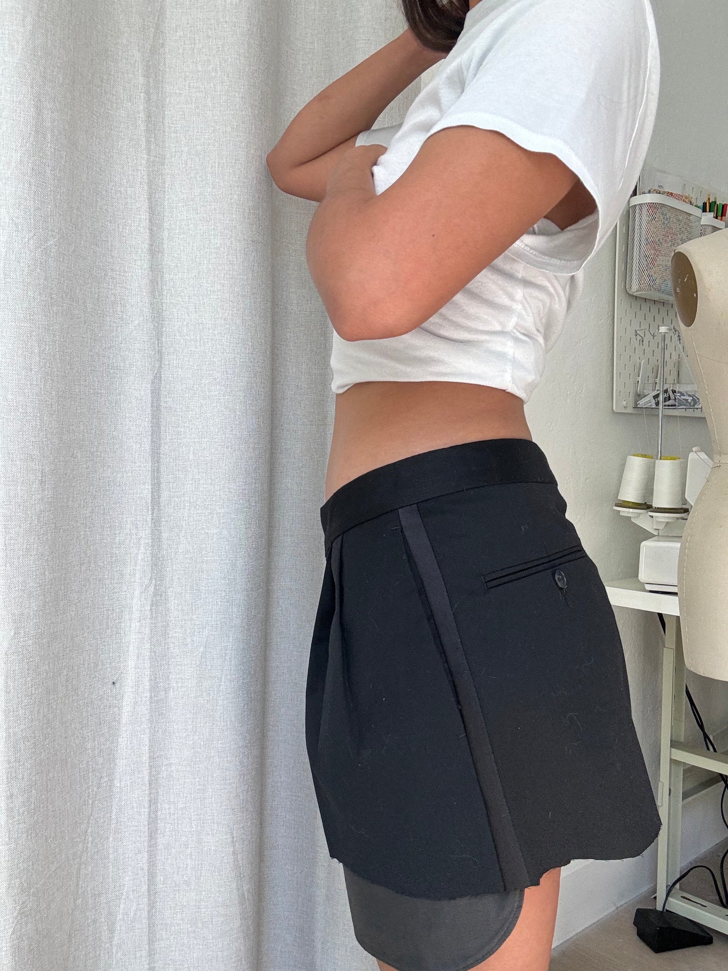 Hand-made from an existing mens trouser. Cutting up the original piece to make an exclusive and one of a kind skirt. Travel Skirt has a of 30" hip.